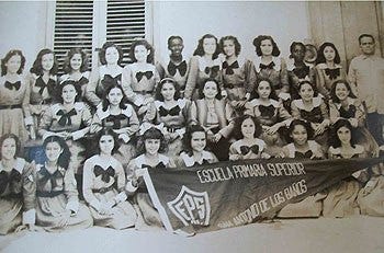 Al centro, la maestra espiritista junto a sus alumnas de la Escuela Primaria Superior de San Antonio de los Baños (Foto: Cortesía de la entrevistada).
