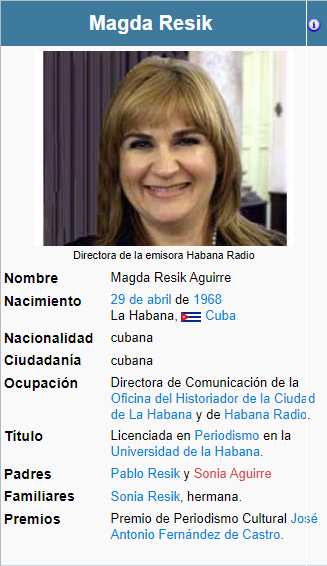 Magda Resik Aguirre. Directora, conductora y guionista de espacios televisivos y radiales. Obtuvo el Premio de Periodismo Cultural José Antonio Fernández de Castro, por la obra de toda una vida de trabajo en la prensa en Cuba. Licenciada en Periodismo en la Universidad de la Habana.
