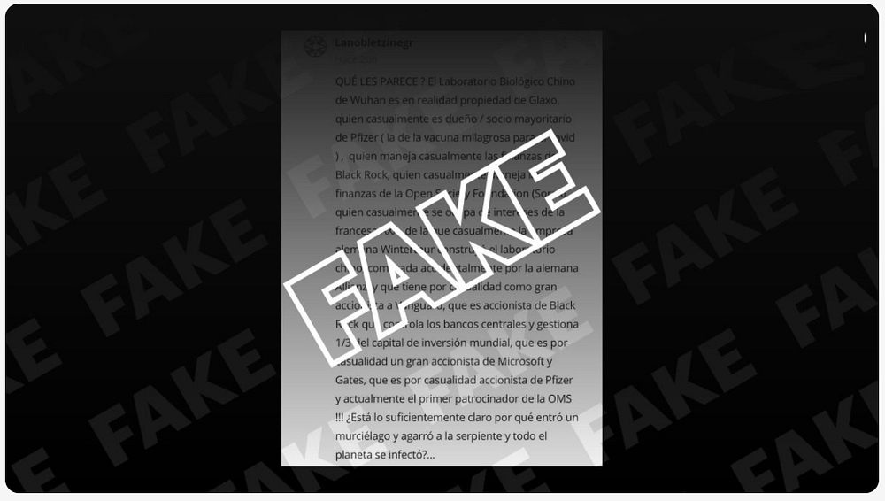 Esto es lo que se dice en el texto: “El Laboratorio Biológico Chino de Wuhan es en realidad propiedad de Glaxo, quien casualmente es dueño / socio mayoritario de Pfizer (la de la vacuna milagrosa para el covid), quien maneja casualmente las finanzas de Black Rock, quien casualmente maneja las finanzas de la Open Foundation Society (Soros), quien casualmente se ocupa de intereses de la francesa AXA, de la que casualmente la empresa alemana Winterthur construyó el laboratorio chino, comprada accidentalmente por la alemana Allianz, y que tiene por casualidad como gran accionista a Vanguard, que es accionista de Black Rock que controla los bancos centrales y gestiona 1/3 del capital de inversión mundial”.