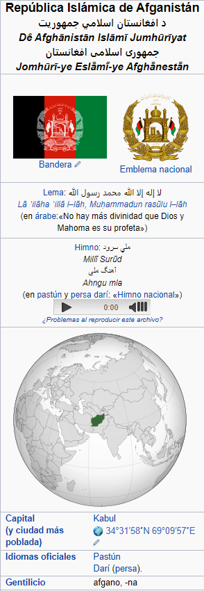Afganistán oficialmente República Islámica de Afganistán (dari: جمهوری اسلامی افغانستان, Jomhūrī-ye Eslā̄mī̄-ye Afghā̄nestā̄n; en pastún: د افغانستان اسلامي جمهوریت, Dê Afghānistān Islāmī Jumhūrīyat), es un país sin salida al mar ubicado en Asia, concretamente en la región de Oriente Medio. Limita con Pakistán al sur y al este, con Irán al oeste, con Turkmenistán, Uzbekistán y Tayikistán al norte, y con la República Popular China al noreste a través del corredor de Wakhan (wikipedia)