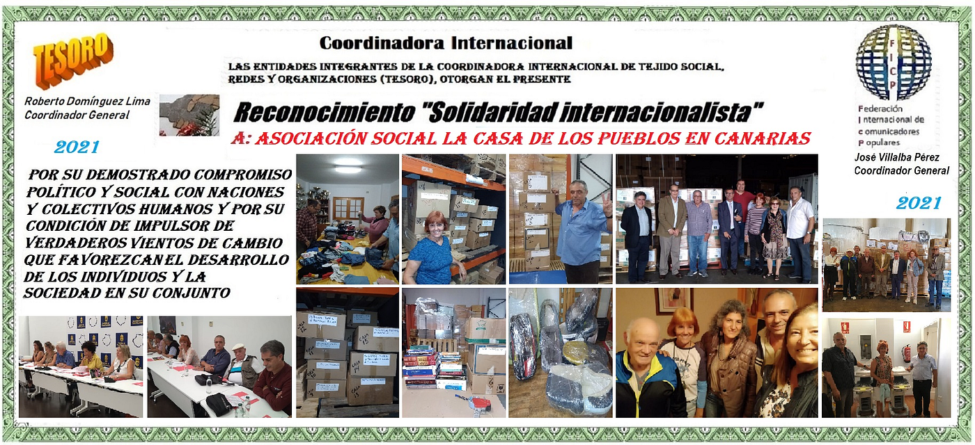 TESORO reconoce esfuerzo, dedicación y cumplimiento del deber. La Asociación Social La Casa de los Pueblos en Canarias. Reconocimiento “Solidaridad Internacionalista” (1)