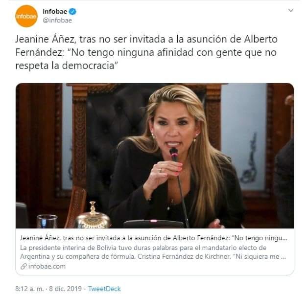 Otros enlaces en el cuerpo del correo electrónico -parecía una historia contada en trinos azules- mostraban un contenido un poco más “polémico”; como el “retuit” del Presidente electo Alberto Fernández haciendo alusión a Bolivia: